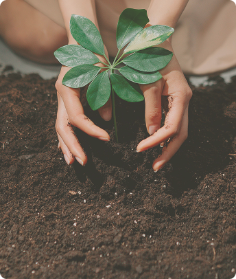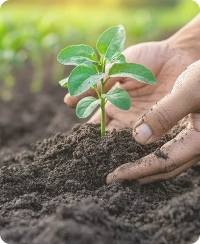 Close‑up of hands gently planting a young green plant in dark soil